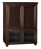 The Savannah Collection, with a rich Mocha Cherry finish, substantial dark brass knobs and turned wood feet, resonates transitional styling and complements your home d�cor.From Bush Furniture's Savannah entertainment collection, this pocket-door armoire houses home-theater components in classically handsome style. The upper portion accommodates most 28- to 36-inch flat-panel TVs (up to 75 pounds) and features panel doors that open wide then slide back along the sides for space-efficient storage that also allows maximum viewing angles. Below, two smaller doors conceal a storage compartment with adjustable shelves for peripherals. Finished in a deep Mocha Cherry veneer with simple molding, turned round feet, and dark brass pulls, this armoire is crisp and tailored, making it very welcoming in a living room, den, or bedroom. There is also an optional glass door kit for a lighter look. The armoire measures 46 inches wide by 23-3/4 inches deep by 60 inches high. Self-closing European hinges ensure smooth, easy access. Assembly is required, and instructions and a toll-free customer help line are included. Six-year warranty. --Kara Karll Features: Pocket-door armoire with deep Mocha Cherry veneer finish and dark brass pulls, Holds most 28- to 36-inch flat-panel TVs (up to 75 pounds) plus peripherals, Adjustable shelves; self-closing European hinges; optional glass door kit, Assembly required; tested for tip-free safety, Measures 46 inches wide by 23-3/4 inches deep by 60 inches high; 6-year warranty Read More