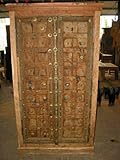Beautifully decorating armoire and hand carved in teak.Rich with culture cabinet belonging to the British raj as well as rustic from India.The carving on the cabinet door are door from the tradition of vastu culture which is the india art of the Indian design and color and occur patina give the cabinet earthy touch. Features: This cabinet has two doors with scalloped arch. Eclectic addition to your interiors the armoire has double hinged doors that fold on the side., This beautiful piece is made of teak wood in an antique brown finish with brass accents all over the door., Crown molding carved at top of the armoire., Our hand carved rustic wood armoire furniture is uniquely designed, which will give you affortable solutions for any room in your home and provide yeas of comfort and enjoyment., Exterior Dimensions : Height 70" x Width 38" x Depth 21"(add 2 inches for crown molding) more...