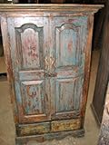 Beautifully decorating armoire and hand carved in teak.Rich with culture cabinet belonging to the British raj as well as rustic from India.The carving on the cabinet door are door from the tradition of vastu culture which is the india art of the Indian design chakra and color and occur patina give the cabinet earthy touch. Features: Hand Carved teak wood rustic armoire antique furniture from India.Crown molding carved at top of the armoire., This cabinet has two doors.Eclectic addition to your interiors the armoire has double hinged doors that fold on the side., Scalloped arch carved at bottom of the cabinet.Two drawers on the bottom of armoire., Our hand carved rustic wood armoire furniture is uniquely designed, which will give you affortable solutions for any room in your home and provide yeas of comfort and enjoyment., Exterior Dimensions :Height 56" x Width 30" x Depth 17"(add 3 inches for crown molding) more...