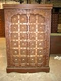 Beautifully decorating cabinet and hand carved in teak.Rich with culture cabinet belonging to the British raj as well as rustic charm from India.The carving on the cabinet door are from the tradition of vastu culture which is the Indian art of the interior design. Features: Hand carved teak wood rustic cabinet, furniture from india.This armoire has floral carving arch frame door., Eclectic addition to your interiors the armoire has hinged doors that fold on the side. Crown molding carved at top of the armoire., This beautiful piece is made of teak wood in an antique brown finish with brass accents all over the door. Scalloped arched base molding., Our hand carved rustic wood armoire furniture are uniquely designed, which will gives you affordable solution for any room in your home and provide years of comfort and enjoyment., 46"x30"x13" more...